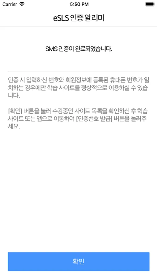 4. 본 페이지의 eSLS 인증 알리미 설치 안내를 참고하시어 어플리케이션 설치 후, 어플리케이션 내에서 SMS 본인 인증 진행합니다.