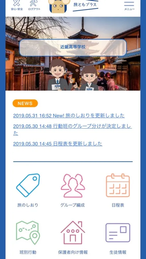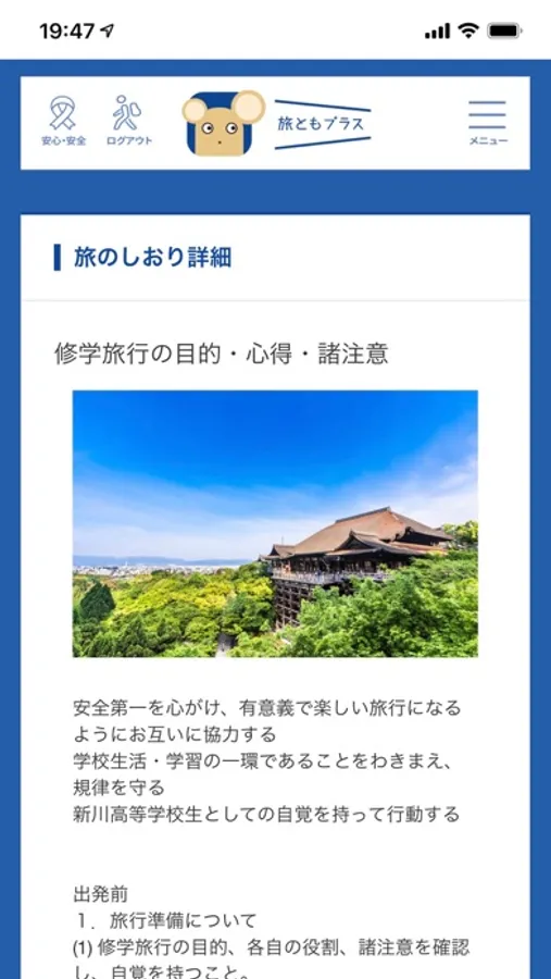 ・・・事前の保護者説明会資料や旅行中の安否確認情報がリアルタイムで確認できます。