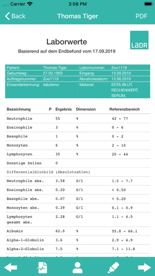 Als Einsender in unserem LADR-Laborverbund bieten wir Ihnen die Möglichkeit, Ihre Laborbefunde mobil abzurufen. Egal ob in der Praxis oder unterwegs – Sie haben Ihre Befunde stets dabei. Mit dieser schnellen und leistungsstarken Anwendung sind die Einzelwerte unmittelbar nach der Validation an jedem Ort der Welt verfügbar.