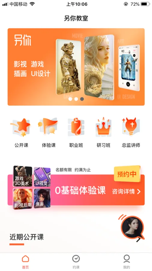在【另你教室】,【体验课程】我们在游戏/影视/UI设计等CG行业的精品体验课,并在课中基于你的作品展示情况给出合理的建议。