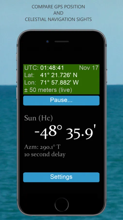 Instantly compare observed celestial navigation altitudes with high precision, live calculated altitudes. Shoot the Sun, tap pause in the app, and get instant feedback.