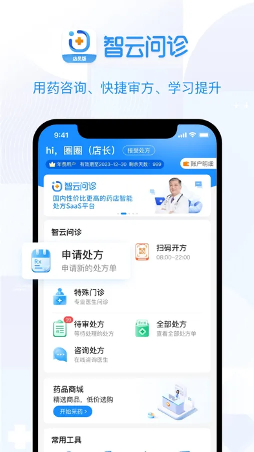 智云问诊是一款为药店服务的专业用药咨询问诊平台,具有互联网医院执业资格执照。可直接与医生远程进行沟通,了解患者病情、过往病史、过往用药情况后,给出用药建议。