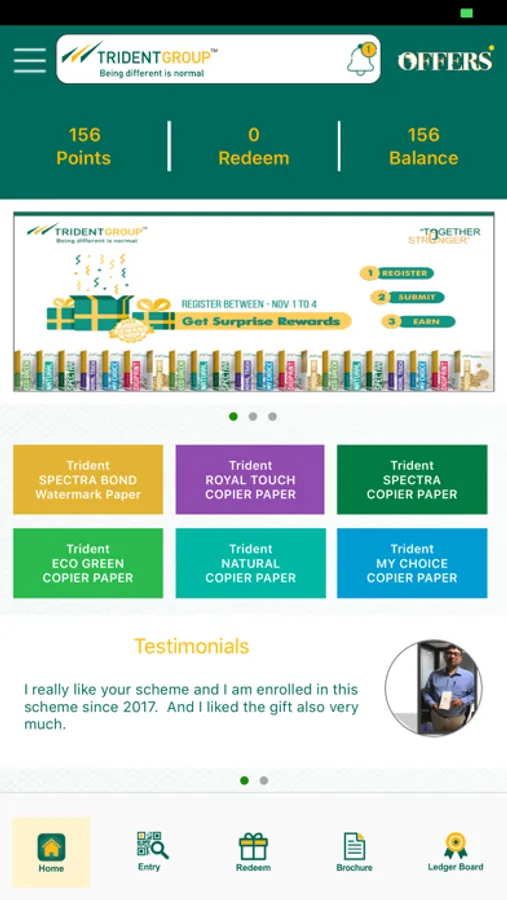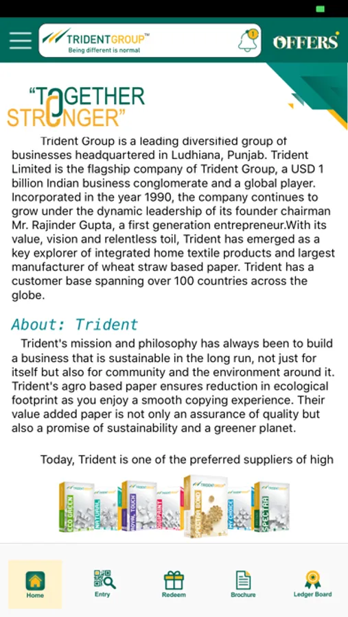 At Trident Group we believe in being "Together Stronger".We believe in being true to quality, our commitment to deliver and finding happiness by bringing value to the lives we touch. Spreading this ideology further we introduce "Together Stronger" as an elite program in the paper industry for retailers. Under this program, retailers will be rewarded for their contribution towards the success of Trident Paper through mobile app "Together Stronger"