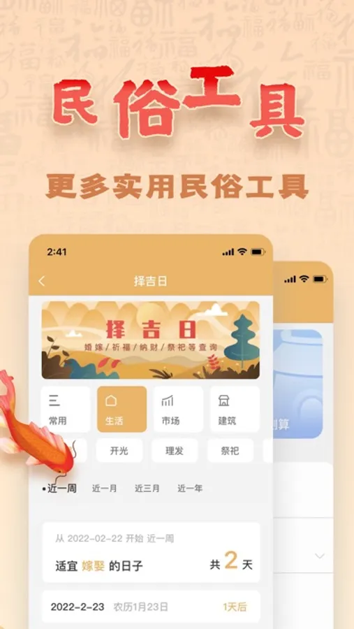 [其他功能] : 婚姻树、祈福台、运程车、周公解梦、八字风水、黄历万年历、吉日查询更多功能等你发现;
