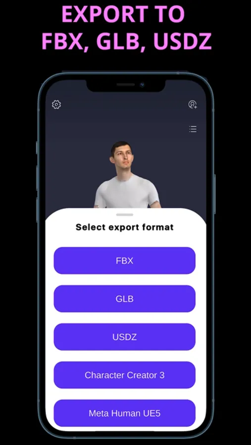 • Export as GLB, FBX, USDZ to Blender, Character Creator, Unity, Unreal Engine, CLO 3D or any other 3D software