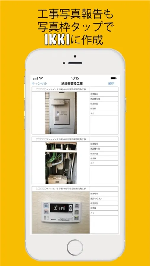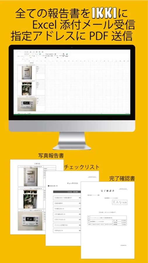 ・写真付き報告書の他、取引先のフォーマットに合わせた「工事完了報告書」の登録が可能。