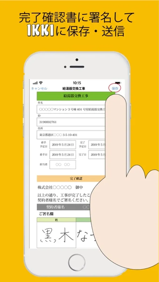 ・お客様直筆の電子サインをフォーマットに挿入。工事の完了確認がアプリで完結。