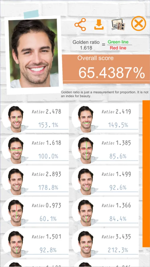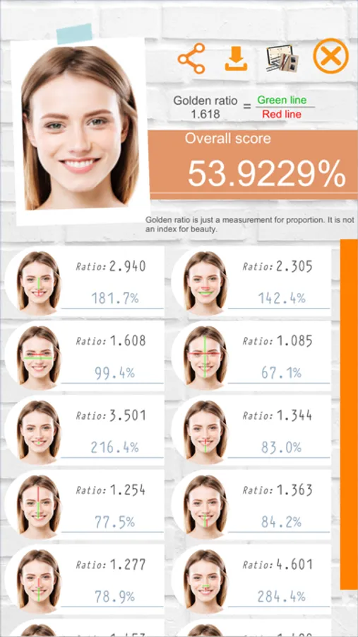 It measures the ratio of facial features and using the golden ratio as a reference, generating the 12 golden ratio scores and the overall percentage of the golden ratio.