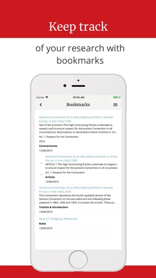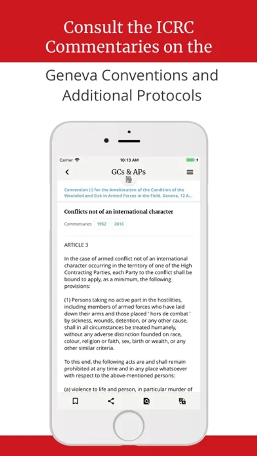 This application (app) provides offline access to more than 80 treaties and other documents relating to international humanitarian law (IHL) – most notably, the Geneva Conventions and their Additional Protocols, the ICRC’s original and updated Commentaries on the Conventions and Additional Protocols, the rules of customary IHL identified by the ICRC’s 2005 study on customary IHL and various ICRC documents on IHL. The app interface can be set to any of the eight languages listed in the settings of the side menu, under “App language”: Arabic, Chinese, English, French, German, Portuguese, Russian and Spanish.