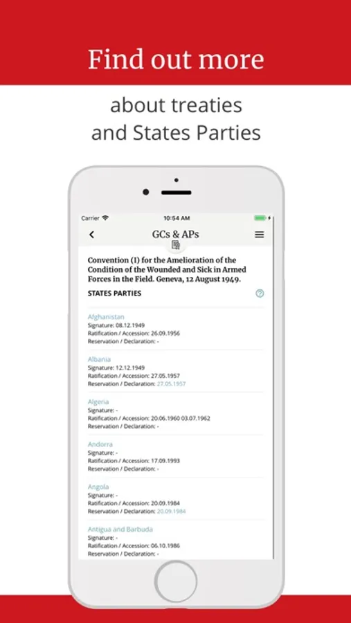 The section on IHL treaties is organized by topic, states parties and date. You can download the list of ratifications in PDF or Excel formats by tapping on “States party to the main treaties” at the bottom of the page. Each treaty has a homepage with an introduction; specific articles can be accessed from this page. The Geneva Conventions and their Additional Protocols are accompanied by the ICRC’s original and updated commentaries. Tapping on “About this text” provides general information about a treaty. If you tap on the name of a state in “State parties”, you are redirected to a list of all the treaties in force for that state.