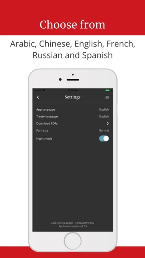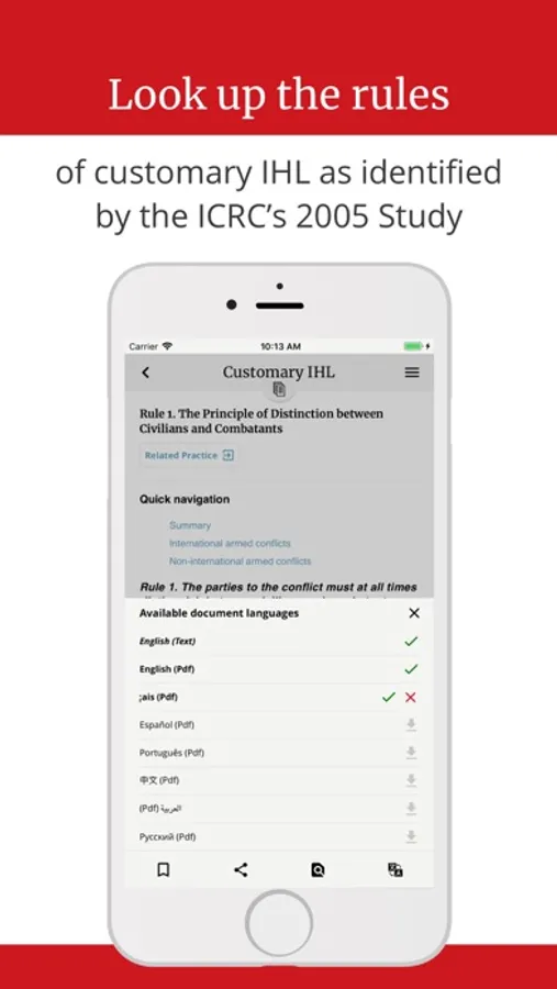 PDF versions of treaties and documents, and of volume I (rules) of the ICRC’s 2005 study, can be downloaded in any of the eight languages – provided the text in question has been translated – by tapping the bottom-right icon when in the document. All available PDFs in your device’s language are automatically downloaded when the app is first installed. We recommend installing a separate PDF reader to view files.