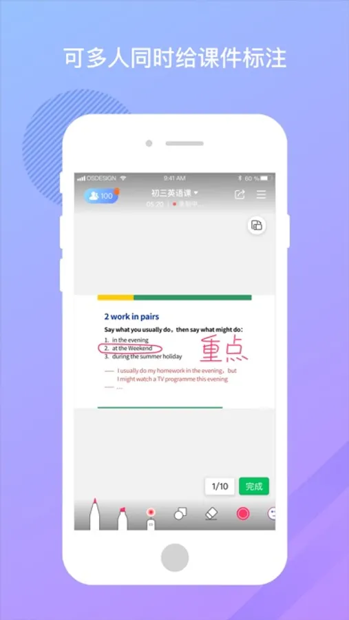 【多素材共享和标注】支持互动式电子白板、教学课件、电脑屏幕等多元素材,支持授权多人同时操作使用,同时允许10个课件组合式教学,满足更多的教学场景。