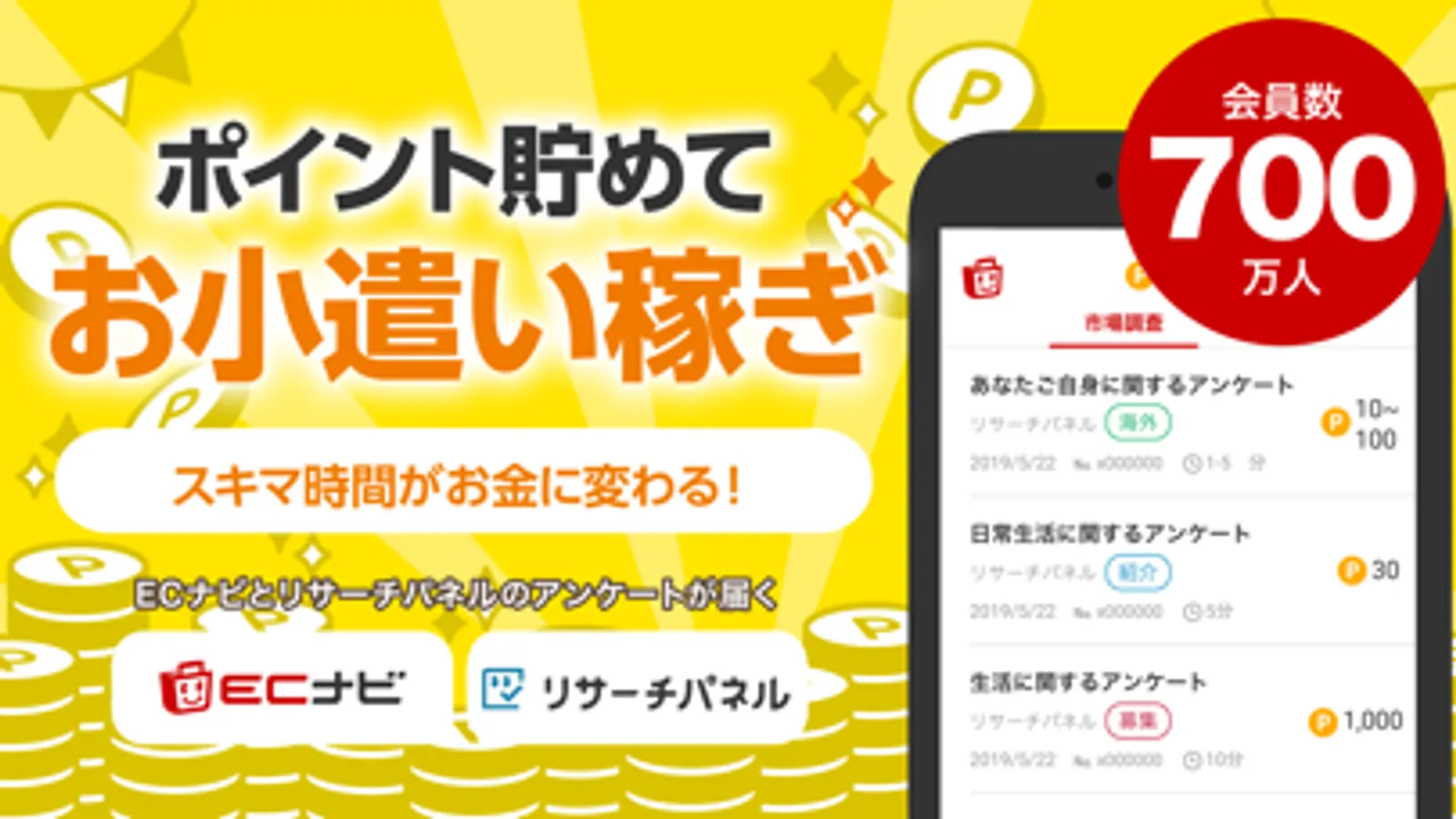 777万人以上が登録するポイントサイト「ECナビ」のアンケートアプリ。
