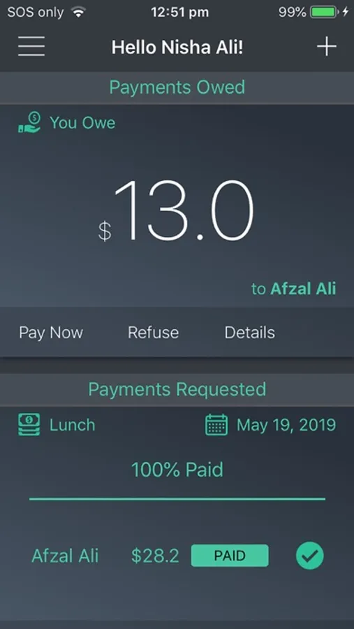 You can request, refuse, delete or mark a payment as paid. A history view lists all the activities of you and your friends whom the payments have requested. You can also block the users from your contact list so you won't see any payments that they have requested.