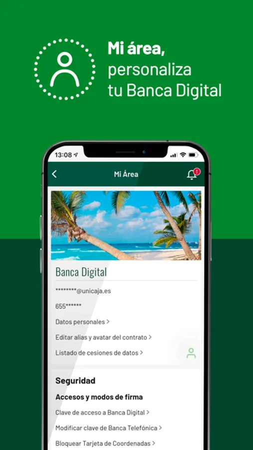 Ahora desde “Mi Área” puedes personalizar tus cuentas y cambiar las opciones de visualización, acciones de seguridad como cambio de clave de acceso a la Banca Digital o bloqueo de tu tarjeta de coordenadas. Además, vas a poder editar tus datos personales, editar tu alias y avatar de contrato.