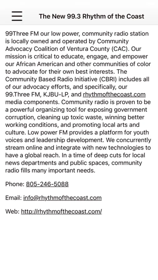 Our mission as a Community Based Radio Initiative (CBRI), 99Three FM, KJBU-LPFM, and rhythmofthecoast.com is to participate in and reflect the diversity of our community by presenting an educational/entertaining broadcast program service for meeting the specific needs of the community in Ventura County, California and on the Central Coast.