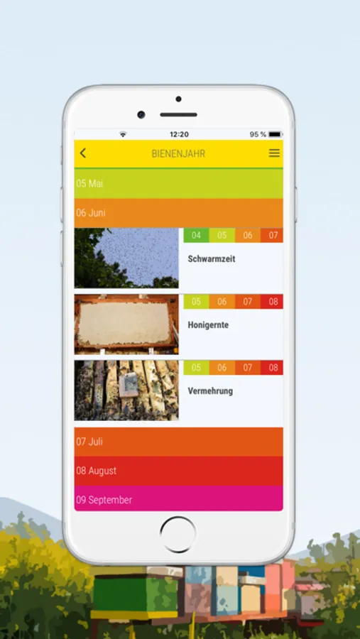 Erhalte wertvolle Hilfe im Umgang mit Deinen Bienen und hole Dir zu jeder Zeit die Information, die Du gerade brauchst. Neulinge und Interessierte sind ebenfalls willkommen und erhalten einen guten Einblick in die Welt der Bienen. Die Imker-App bietet Dir viele Funktionen rund um das Bienenjahr. Du findest den einzelnen Monaten zugeordnet Hilfestellung zur Verjüngung, Schwarmzeit, Spätsommerpflege, Vermehrung und Honigernte. Jeder einzelne Bereich bietet Dir ein interaktives Zusammenspiel relevanter Informationen mit schnellem Zugriff.