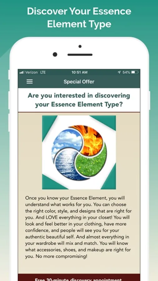 This app is designed to inspire, to empower, and to allow you to discover who you were born to be. Embracing your true self is the essence inside of you allowing one's confidence and most authentic self to shine. So I have designed a five-step color typing system to find one's core element. The four elements are air, fire, earth, and water which embody certain specific characteristics. Each element has unique aspects that have the ability to light up a person when they are wearing their perfect color and textured fabric. Go ahead and make the transformation; but don't just take my word for it, give it a try to see and feel the difference!