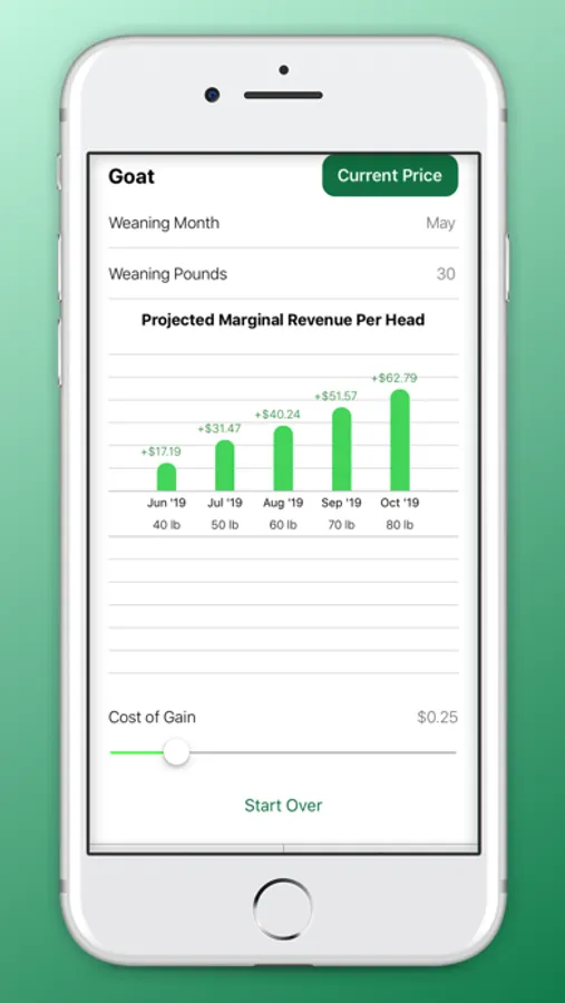 This application is designed for Texas sheep and goat producers to predict the change in value of light weight slaughter lambs and kid goats. The program requires producers to designate the month they intend to sell their animals, the weight of the animals, and cost of gain if they were to retain ownership. Thereafter, the application uses market data collected from Producers Livestock Auction Co. in San Angelo, TX dating back to 2010 to predict change in value (Marginal Revenue) based on month, weight gain, and cost of gain. The application does not forecast actual prices, but rather estimates the change in per head value that normally occurs in the market based on month and market weight. The application also reports the current value ($/Hd) and market price ($/Cwt.) and has a link to USDA-Agricultural Marketing Service reports, so that producers can easily assess current market conditions.