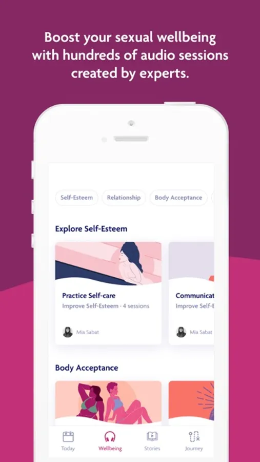 ••• Our team of women's health experts has developed 500+ audio wellbeing sessions to explore desires, increase physical affection and create intimacy. Including tips on how to manage menopause, explore your body acceptance, explore desires or give pleasure to your partner, among many others.