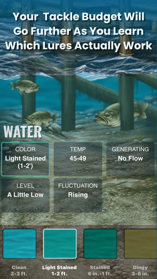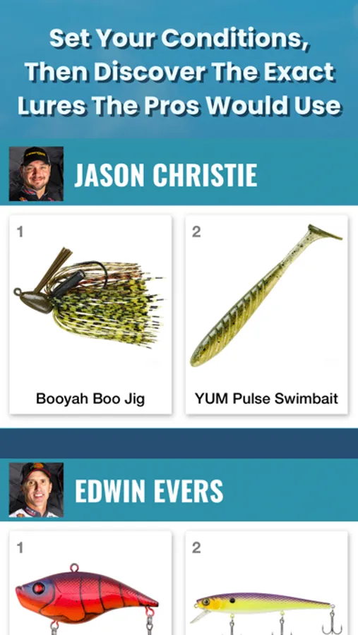 Just set your location on the map, enter the conditions for your fishing day, and our bass pros will show you which specific baits have worked for them under those exact same conditions. They’ll give you the details all the way down to bass lure names, colors and sizes to help you get dialed-in to the best bite quickly.