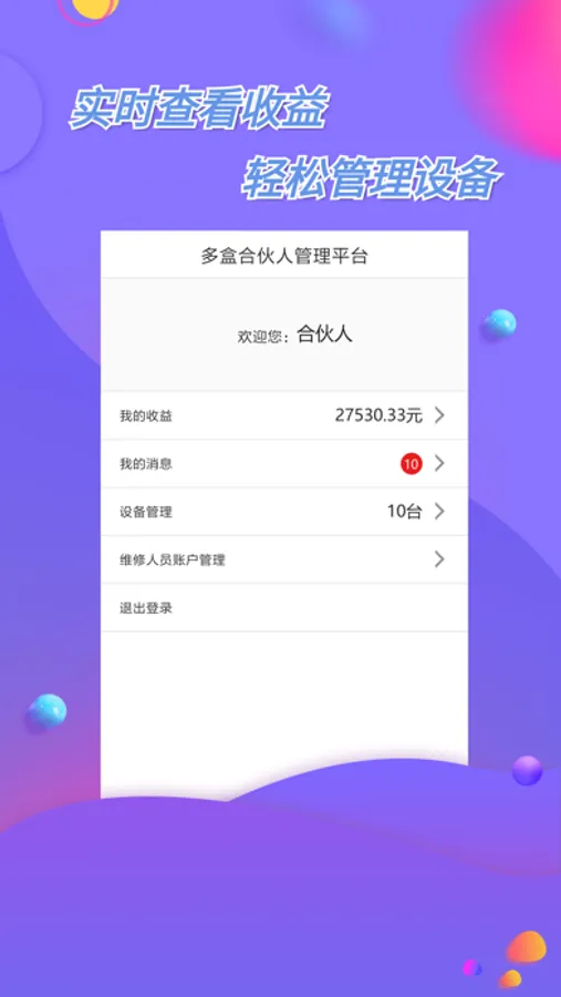 合伙人运维平台是多盒面向合伙人提供方便快捷的工具平台.多盒合伙人可通该平台查阅到精准的合作社区信息,同时合伙人的维修人员可使用该工具来监测设备状态.随时掌握设备情况.