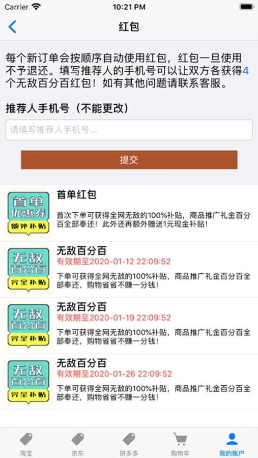 请先领取优惠券后购买,确认收货后还可获得现金补贴。随时查询到每一笔订单的补贴收益,随时可以将补贴提现。