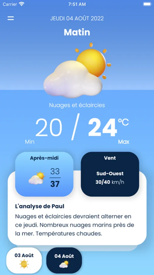 Avec cette app, vous visualisez les prévisions météo pour la journée et la tendance des prochains jours.