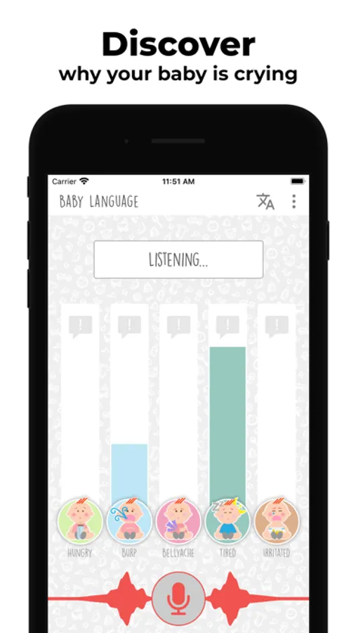 The Baby Language app has a tool that recognizes and translates your baby cries into understandable language, and it teaches you how to master this skill yourself. The app also gives you many ways how to handle each specific cry, and finally the app contains lots of tips and tricks to prevent or reduce any specific baby cry.