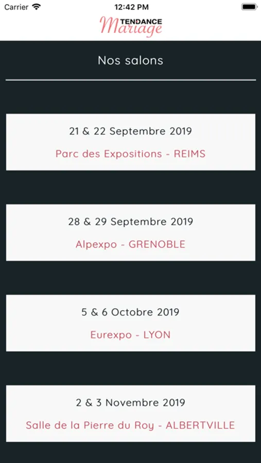 Téléchargez Tendance Mariage, l’application officielle des Salons Tendance Mariage dans 4 régions françaises : Bretagne, Pays de la Loire, Champagne Ardenne et Rhône Alpes. Appli 100% gratuite !
