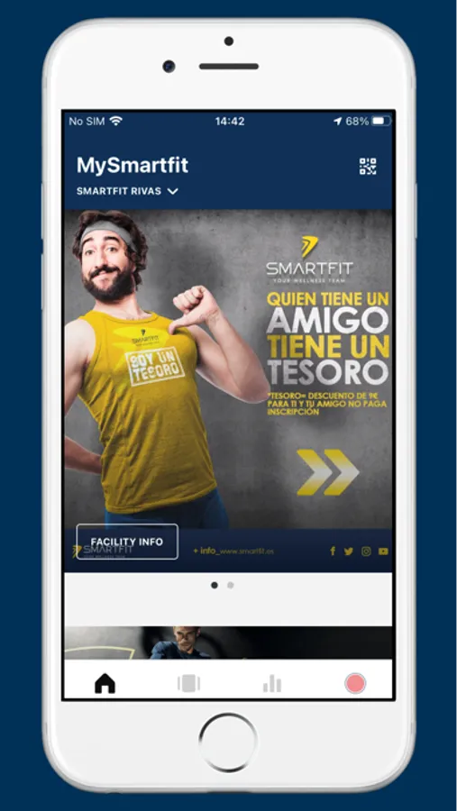 MySmartfit es la aplicación que te permitirá tener tu rutina de entrenamiento y realizar tus reservas de clases fácilmente. Descárgate la app y descubre cómo hacer de tu entrenamiento algo mas interactivo, entretenido y sobre todo obteniendo datos objetivos. Te permitirá ver videos de los ejercicios a realizar, cargas que utilizar y tiempos de descanso. A parte podrás conocer tus progresos gracias a la introducción de valores biométricos. Con la ayuda de nuestros profesionales tendrás la rutina adecuada para ti, pudiéndola incluso sincronizar con otras aplicaciones de actividades fisicas al aire libre, para que puedas conocer al 100% cuál es tu nivel y tus progresos.