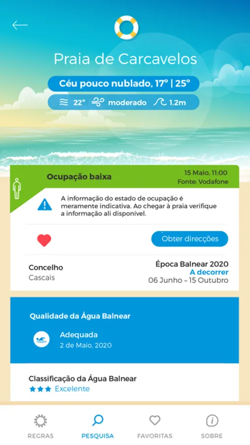 Pode definir as suas praias favoritas e ficar a conhecer a qualidade da água, galardões atribuídos, equipamentos e serviços existentes, bem como consultar as últimas análises da qualidade da água balnear.