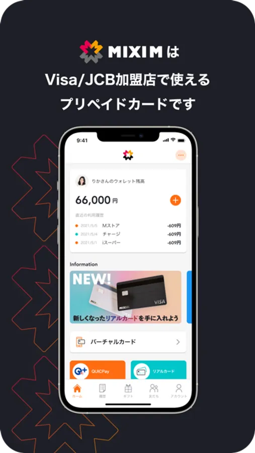 アプリ上で簡単に発行できるブランドプリペイドカードです。VisaおよびJCB加盟店で利用可能です。(一部加盟店を除く)