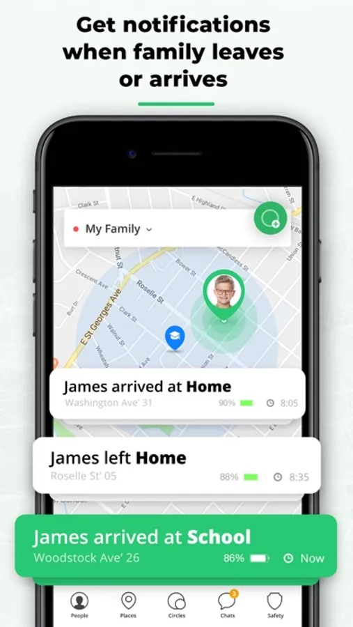 ⁃ Receive Real-Time Smart Notifications When A Friend Or Family Arrives, Leaves Home, Work, School, Gym etc.