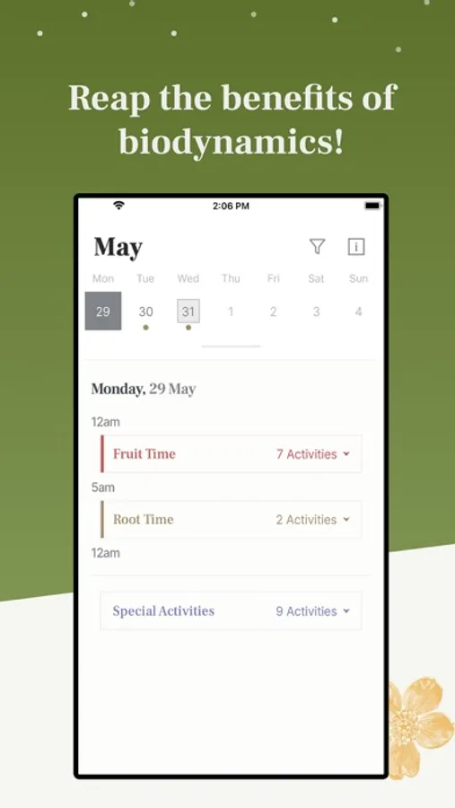 The biodynamic method is used by farmers and gardeners all around the world to improve the quality of their plants. Based on 50+ years of research, it takes into account solar rhythms and the movements of planets, as well as lunar cycles. Now, you too can reap the benefits of the biodynamic method with the help of this app. The Biodynamic Gardening Calendar makes it easy for beginners and experienced biodynamic farmers alike to put this tried and tested method into practice.