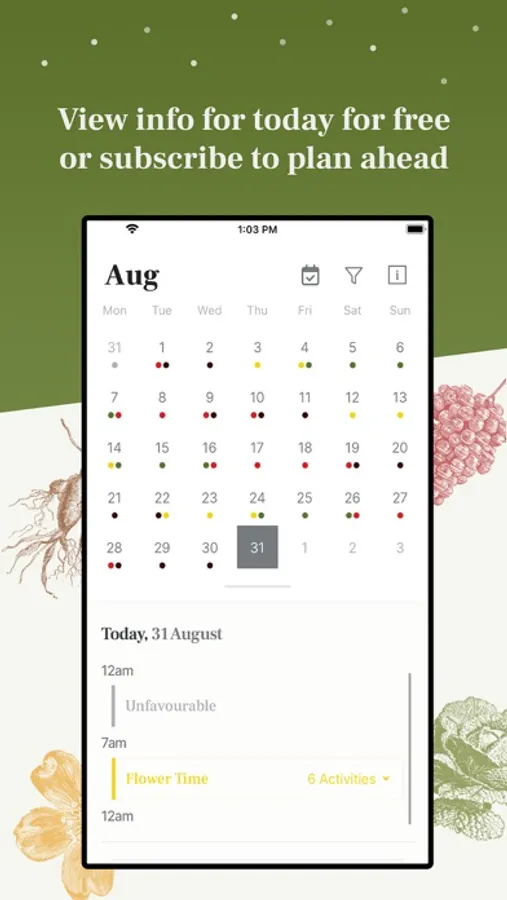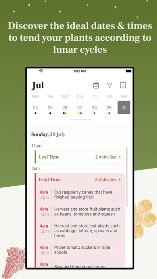 * Daily activities are sorted by Time Type (showing you when to work with fruit, root, flower or leaf plants) and Special Activities (such as pruning and pest control), making it easy to find out what you should do
