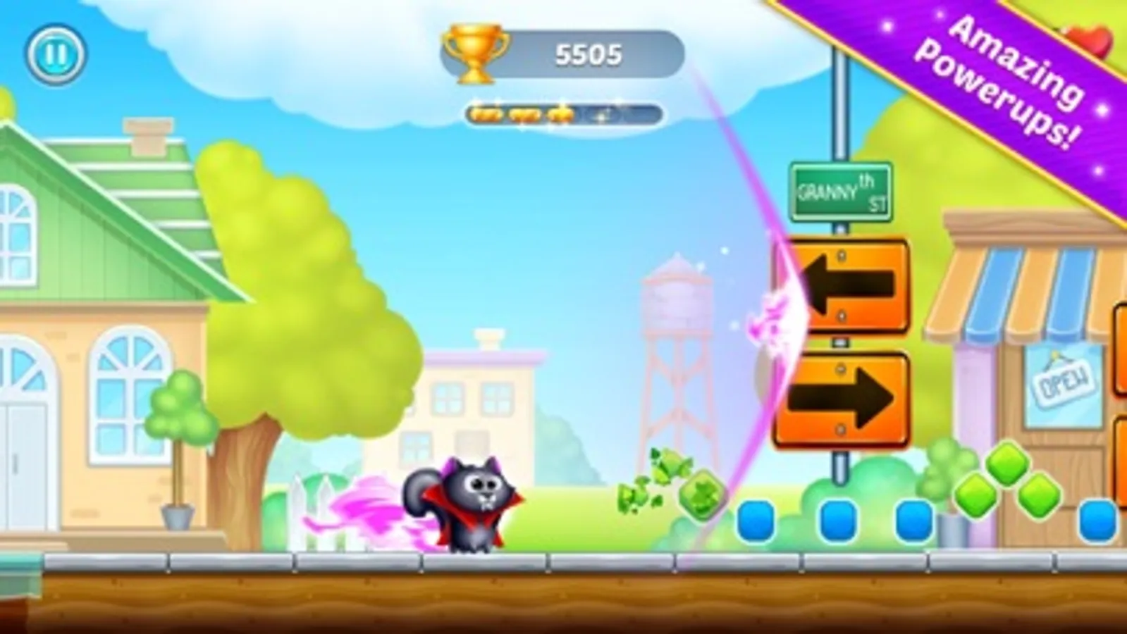 Carefully duck beneath road signs and rope swings, time your jumps over fire hydrants and trash cans, or double jump across moving, floating platforms — all the while building a high score to compete on the leaderboard. You’ll love the intuitive, responsive controls that make Happy Kitty Run such a fun, smooth, and enjoyable gaming experience.