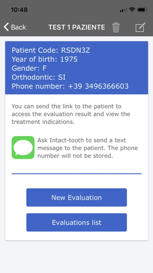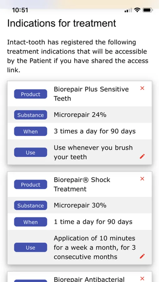 Intact-tooth is accompanied by an extensive collection of therapeutic protocols aimed at desensitization and remineralization of the teeth. The collection also includes pre-during and post orthodontic treatment protocols, in order to guarantee the health of hard and soft tissues. The choice of the appropriate protocol for the patient's needs is made by the professional to whom a reference library is made available based on the scientific review of the literature. The adoption of all the pre-identified and assigned therapeutic protocols through the App will allow analysis of statistical efficacy data and these data can be used for scientific research purposes.