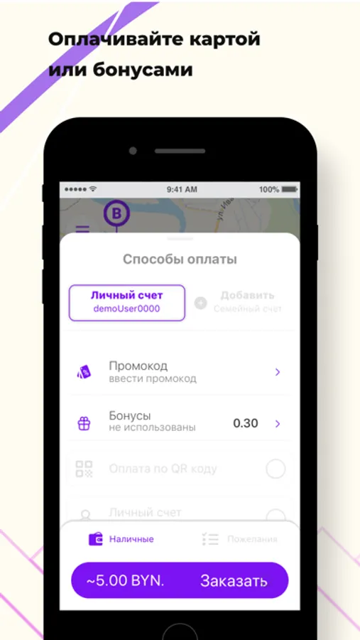 Оплачивайте поездки наличными, картой или накопленными бонусами. Также вы можете оплатить поездку через любое банковское приложение по QR-коду.