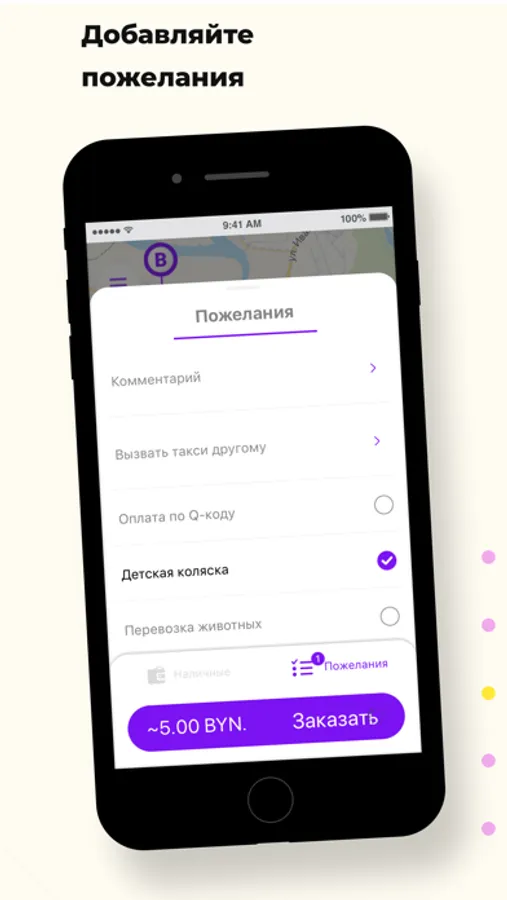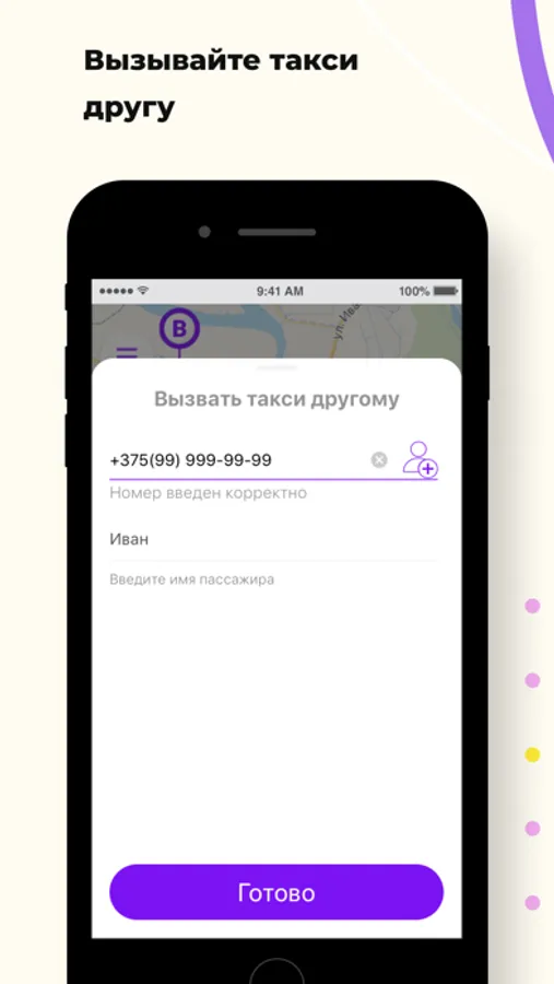 Используйте опцию “Вызвать такси другому” в разделе “Пожелания” и укажите его номер телефона. Когда такси подъедет, на указанный номер придет СМС, а вам — сообщение в приложении.