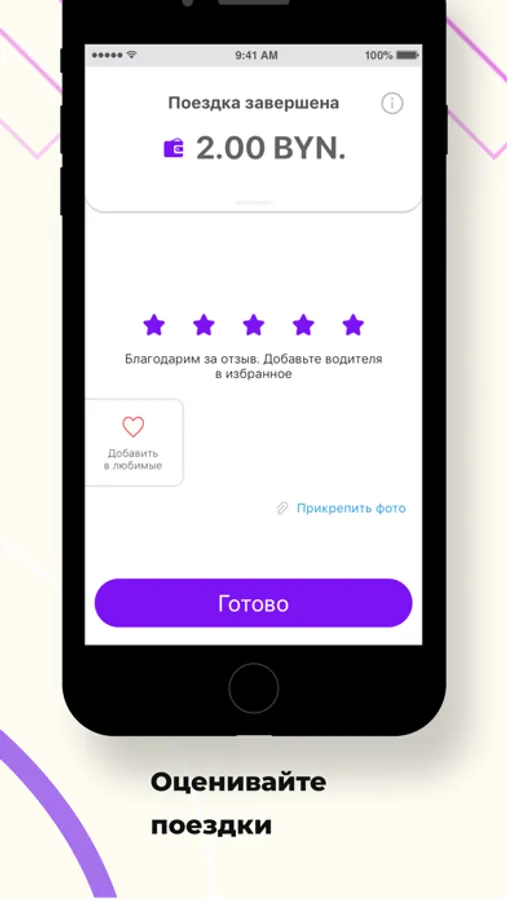 Поставьте оценку водителю, напишите отзыв или выберите реакцию из готовых шаблонов. Прикрепите фотографию к отзыву, оставьте чаевые или посмотрите детализацию платежей после поездки.