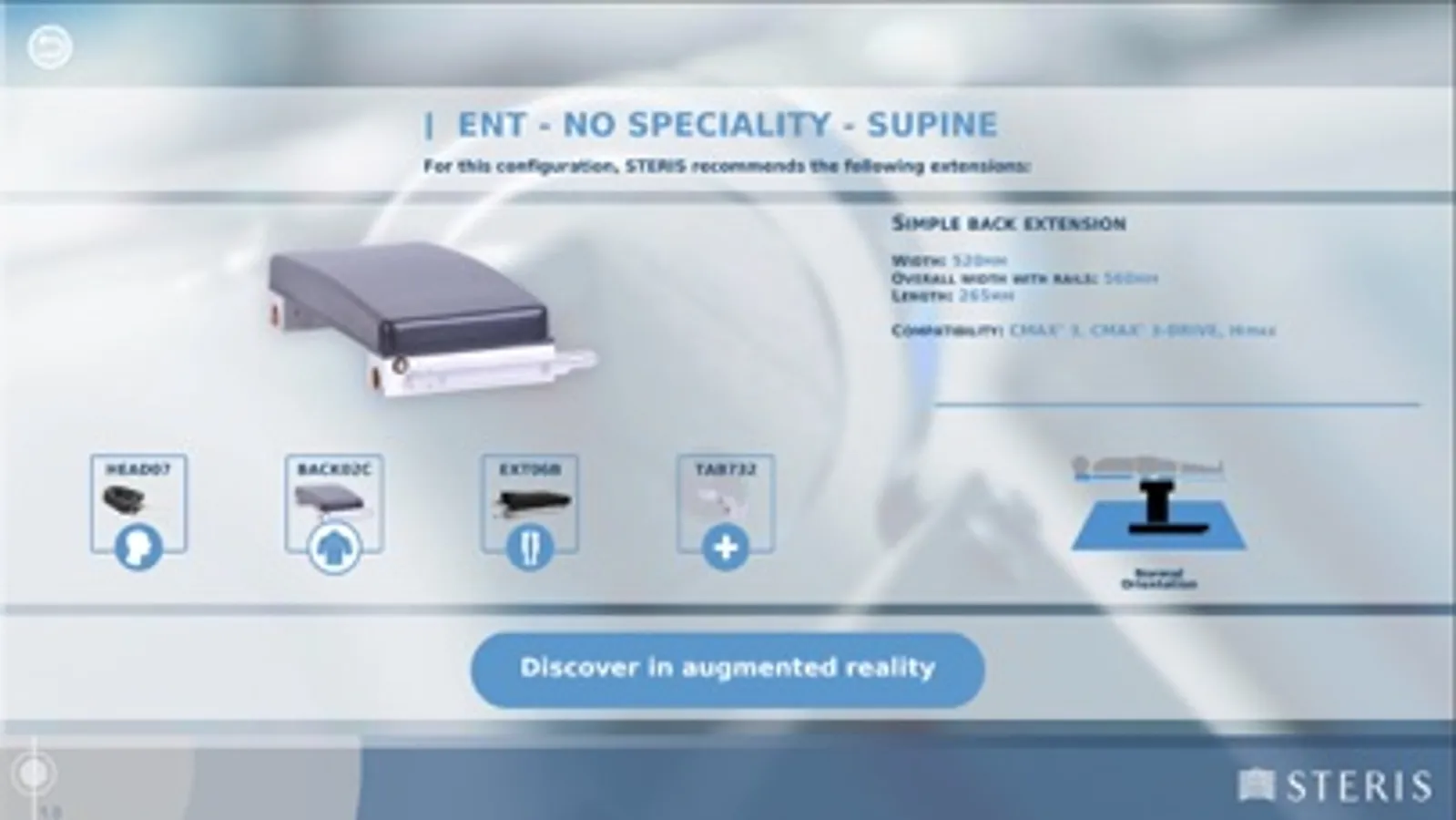 The augmented reality feature allows realistically, the integration in the real environment (operating theatres, trade shows ...) of the table with its configurations.