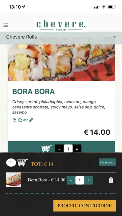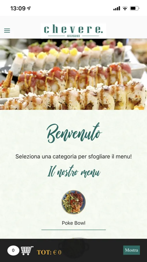 Con Chevere puoi ordinare il tuo Sushi o il tuo Poke bowl! Ci troviamo ad Acireale. Sfoglia il menu, scegli cosa vuoi ordinare, seleziona la modalità (take away o delivery) e concludi l'ordine (pagamento anticipato o in contanti). Tutto in pochi semplici click.