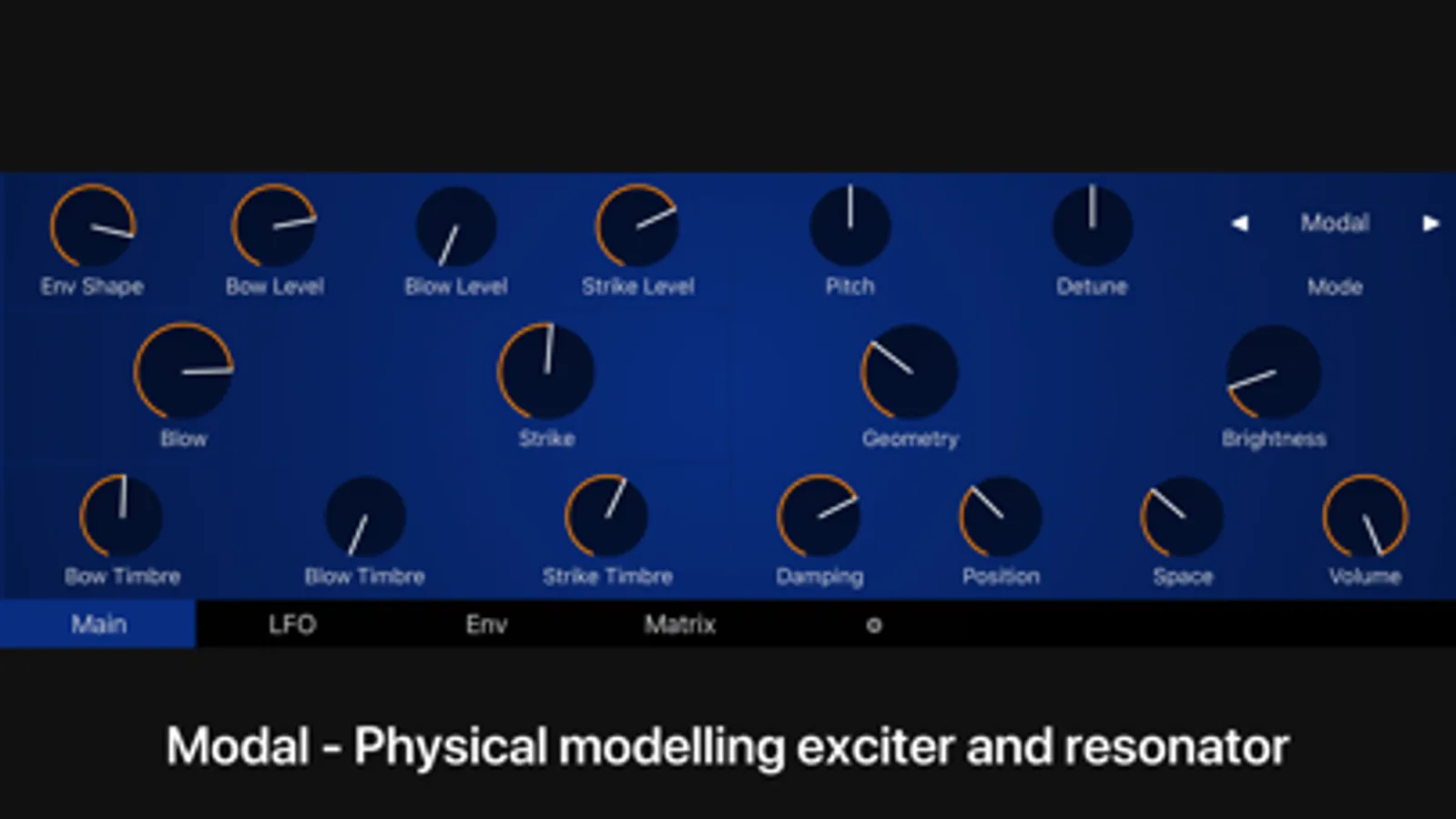 Modal - Modal synthesis. Bowed, Blowed, and Struck sounds through a 64-band resonator. Also included as an effect.