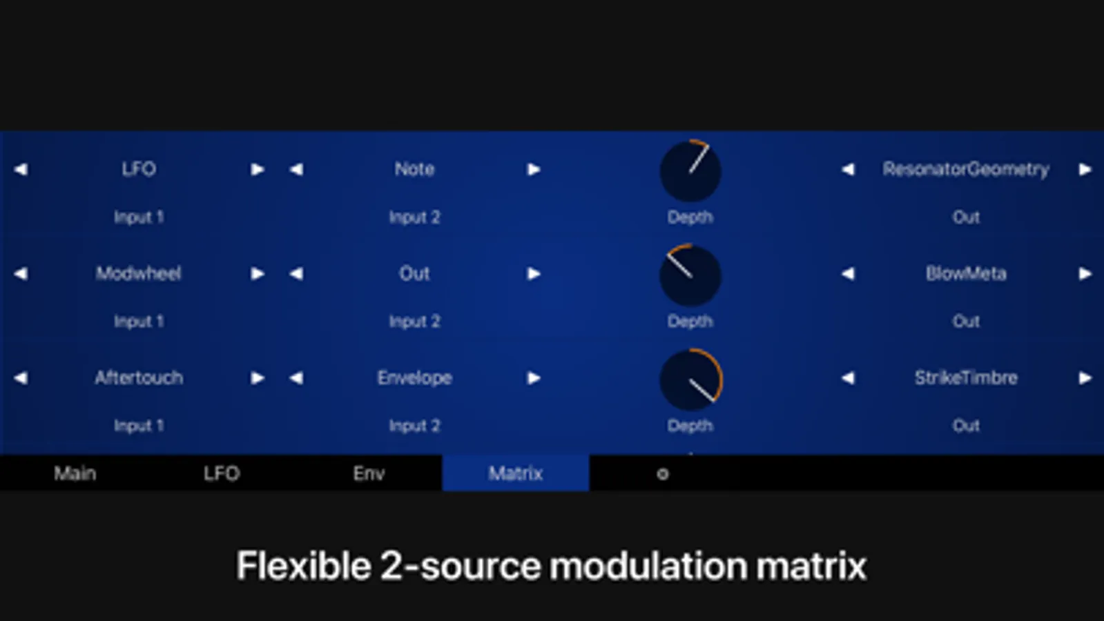 - 2-source modulation matrix allowing for complex and evolving patches.
