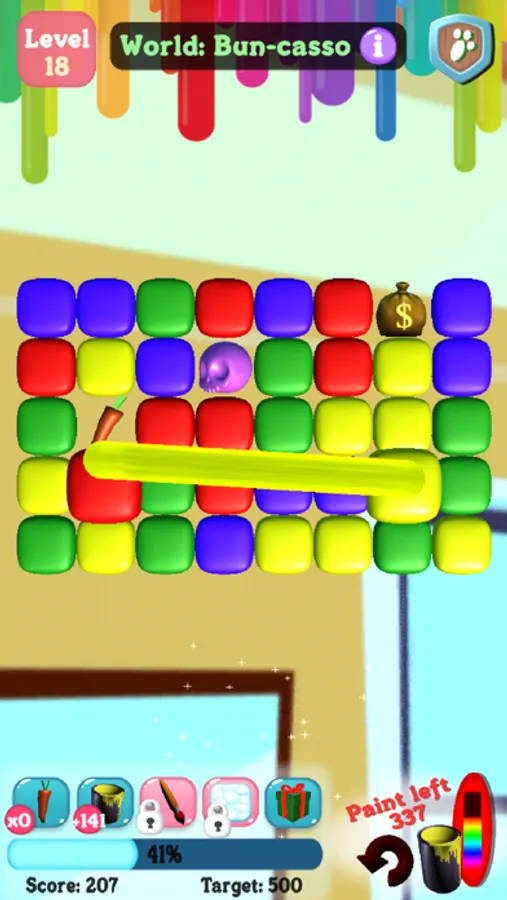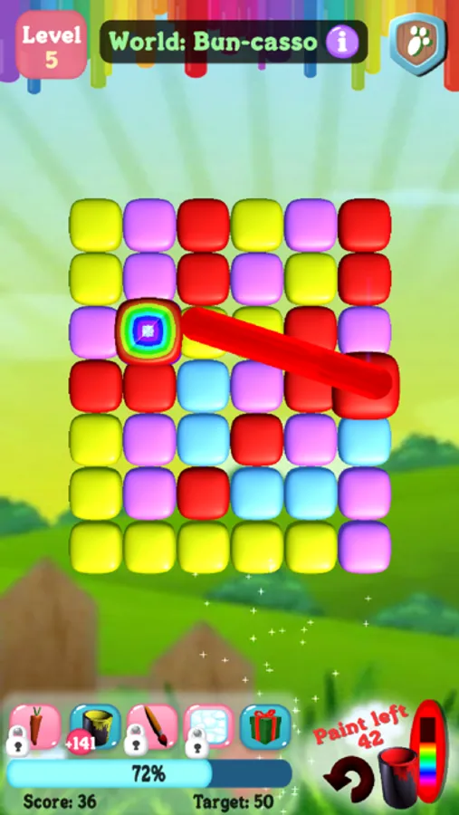 Start playing Hoppy Brush today! Easy-to-play - just paint two like colored lines and clear rows. The more like lines you clear, the higher your score. In this ultra-fun, painting, rabbit-themed game, you'll be solving a challenging world of puzzles by painting (artistically) to help Bini the Bunny get reunited with his mom.
