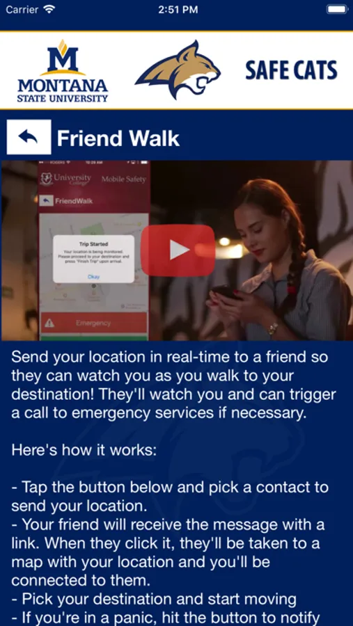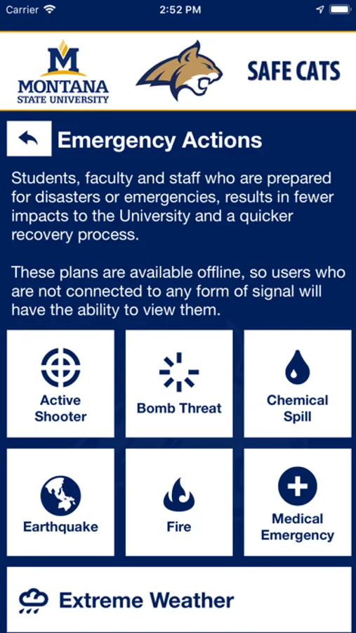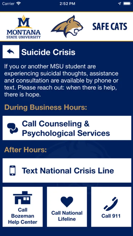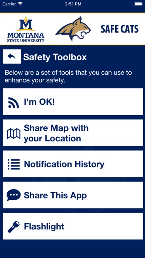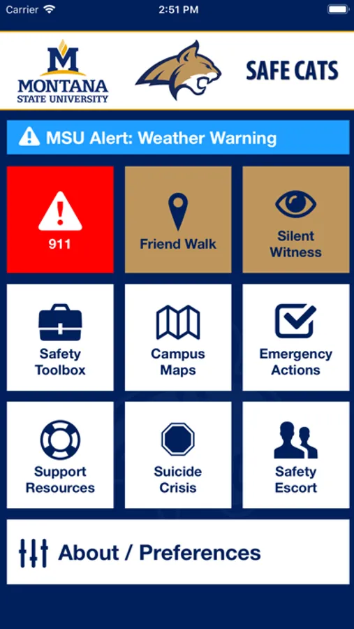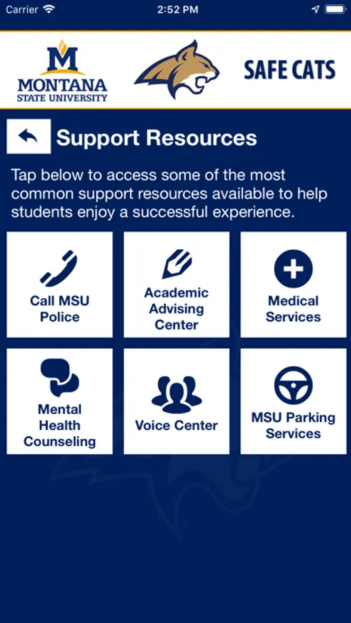 Safe Cats is the official safety app of Montana State University. It is the only app that integrates with MSU's safety and security systems. The MSU Police has worked to develop a unique app that provides students, faculty and staff with added safety on the Montana State University campus. The app will send you important safety alerts and provide instant access to campus safety resources.