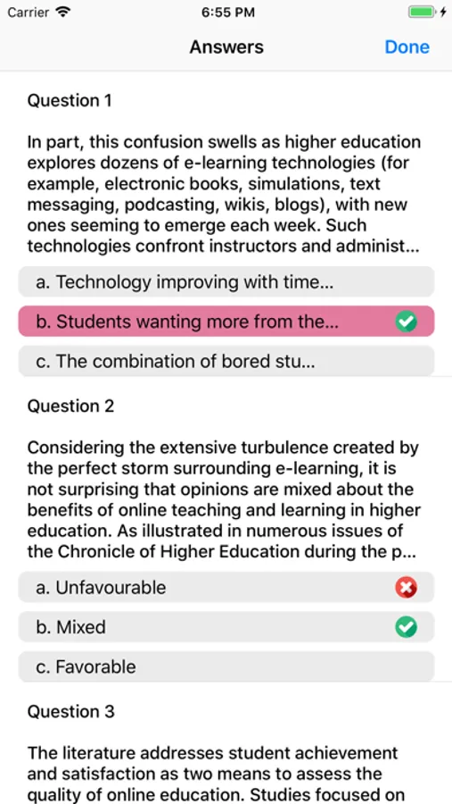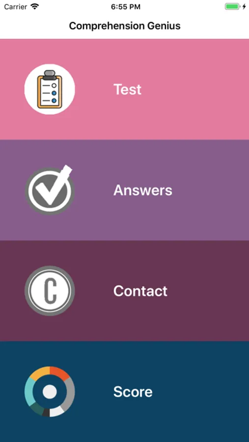 The app contains 50 questions and multiple choice answers. Your score is shown at the on each test and all the correct answers are revealed. The app is tracking your progress and informs you of your improvement at the end of each test.