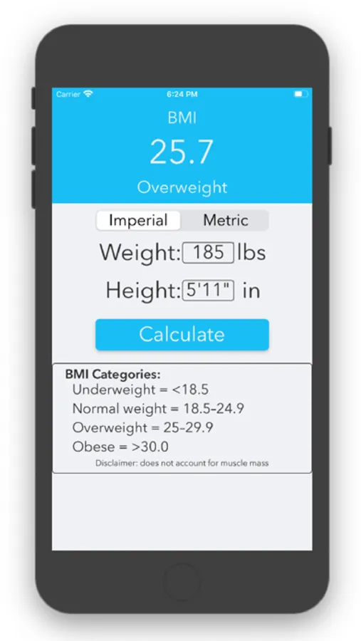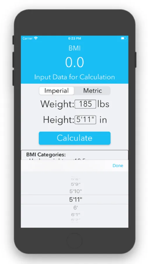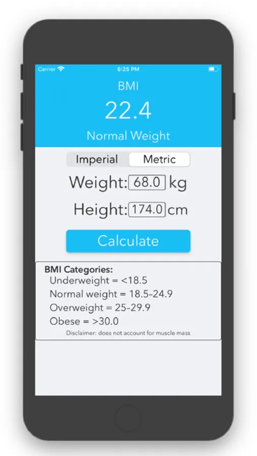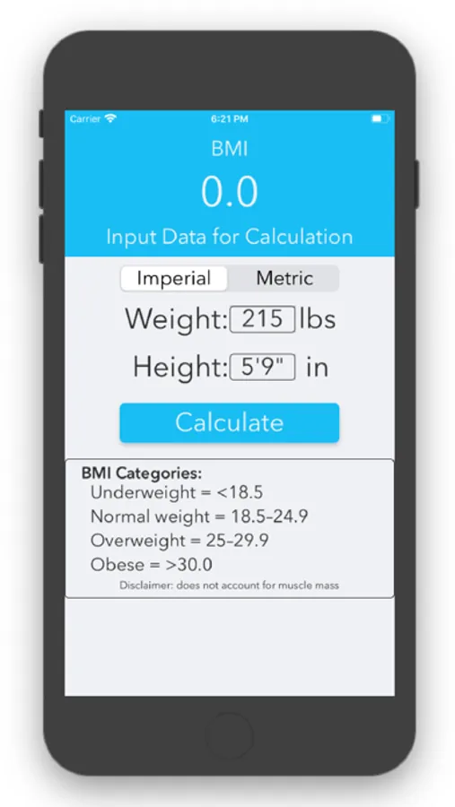 •There are two ways you can measure your BMI in the app! Imperial (lbs, ft, in) and Metric (kg, cm)!