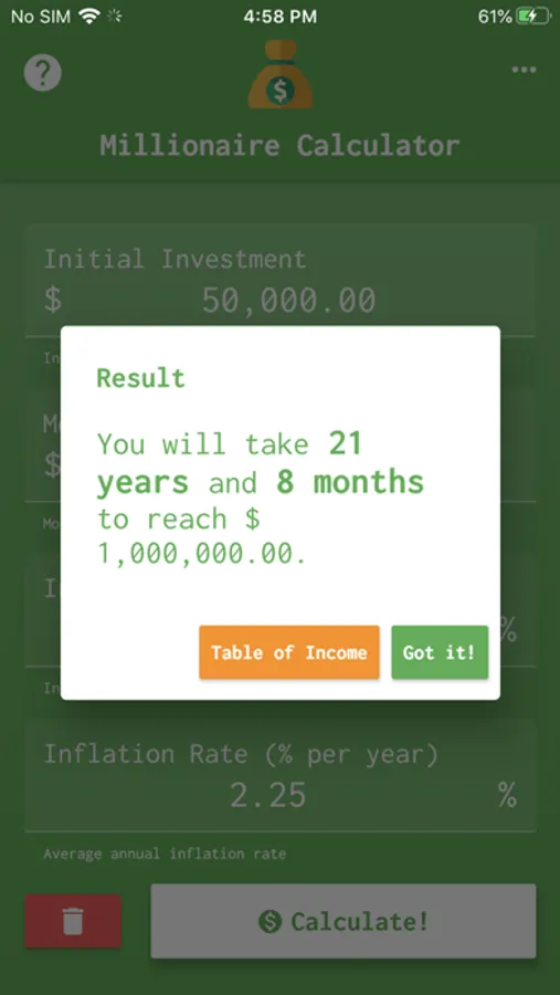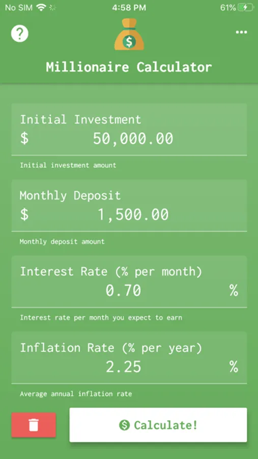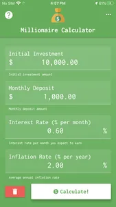 The calculator works in a very simple way. Just enter the initial investment, the deposit value that will be contributed monthly, the monthly interest and inflation. At the end of the calculation, the number of years and months until you reach the amount of one million will be displayed.